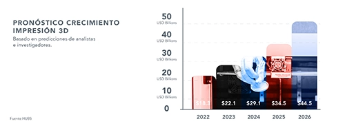 De acuerdo con un informe publicado por MexicoIndustry, en 2022, la impresión 3D contaba con un valor estimado de más de 18 billones, pronosticando para el 2026 un valor de alrededor de 45 billones de dólares.